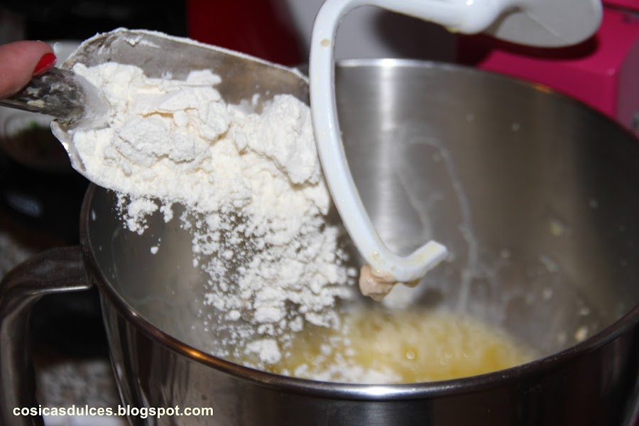Mezclamos bien y añadimos la levadura, volviendo a mezclar hasta que se disuelva la levadura. Incorporamos la harina amasando bien hasta obtener una masa elástica.