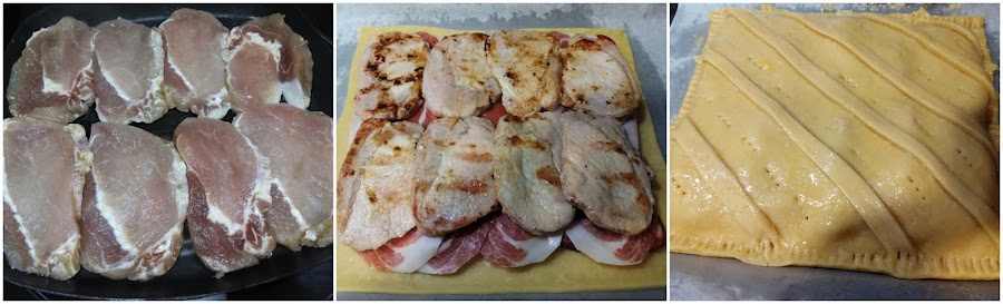 Asamos los filetes de lomo, no demasiado para que no queden secos. Colocamos una de las partes de la masa ya estirada en la bandeja del horno y colocamos encima y por este orden el chorizo cortado en rodajas, el jamón serrano en lonchas y encima el lomo. Cubrimos la empanada con la otra mitad de la masa estirada, hacemos unas decoraciones con retales de masa sobrante y pintamos con huevo batido la superficie. Pinchamos un poco la superficie con un tenedor y horneamos a 180º durante 30 minutos (hasta que este doradita la superficie).