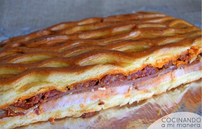 Repartimos el relleno sobre la masa: primero los filetes de lomo, luego las lonchas de jamón y por último las rodajas de chorizo. Cubrimos con la otra parte de masa, cortamos el sobrante y cerramos bien los bordes, presionando para que no se abran. Pinchamos la parte superior con un tenedor.