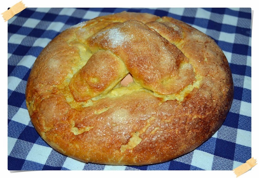 Esta torta dulce llamada "Hornazo" que hoy os traigo es típica del tiempo de Cuaresma, más concretamente es tradicional comerla el domingo después del de Resurrección. Pero para que vayáis practicando os la pongo ya! :P. La receta es la que comúnmente hacen en Puertollano (Ciudad Real), pero hay muchas otras, aunque si tengo que elegir me quedo con esta sin dudarlo! Porque esta riquísima!