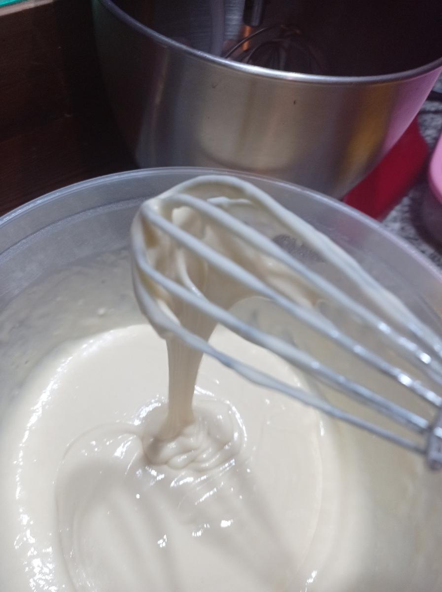 Intenta que la masa no quede ni muy dura , ni muy líquida, el punto seria cuando cae espesa de la cuchara.