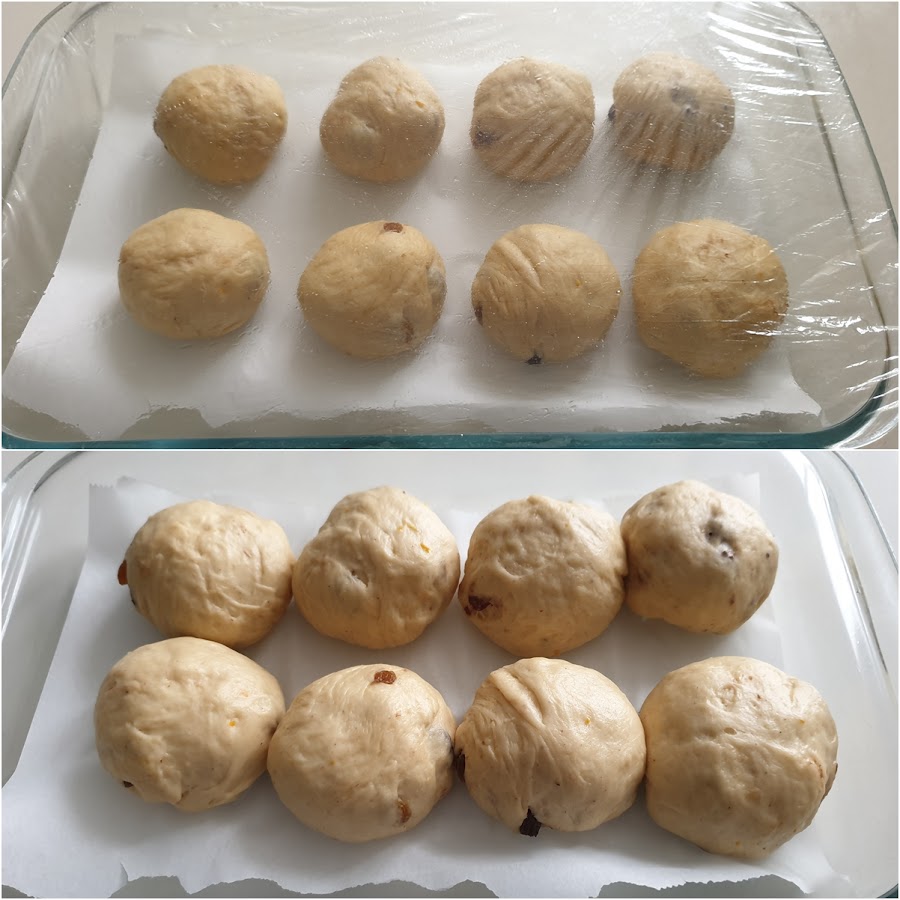 8. - Pintamos los bollos con huevo batido y le hacemos la cruz por encima. Y metemos al horno 18 minutos, o hasta que estén todos bien dorados.