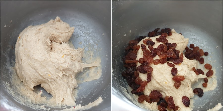 4. - Añadimos las pasas y volvemos a amasar, formamos una bola, la ponemos en un bol engrasado, tapamos con film y dejamos en un lugar cálido durante 2 horas, hasta que doble o triplique el volumen.