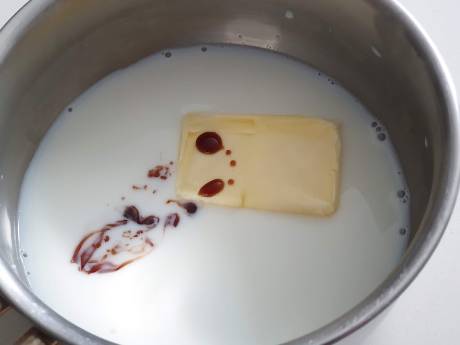 1. - En un cazo calentamos la leche con la mantequilla y la vainilla, hasta que se derrita por completo.