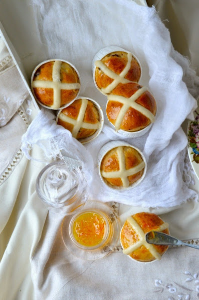 Y es que hay muchas leyendas populares en torno a estos bollitos (Hot Cross Buns). Por ejemplo, si lo llevabas en un viaje en barco, te libraba de zozobrar. También se dice que si se cuelga uno en la cocina, ésta estará protegida contra el fuego y el pan salía perfectamente siempre. Se tenía ahí colgado hasta el año siguiente que se hacían de nuevo y se colgaba otro fresco. (No me quiero imaginar cómo estaría el bollito después de un año). Me da miedo hacer la prueba y dejar uno en mi cocina....