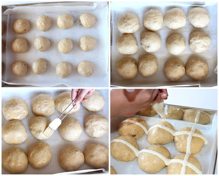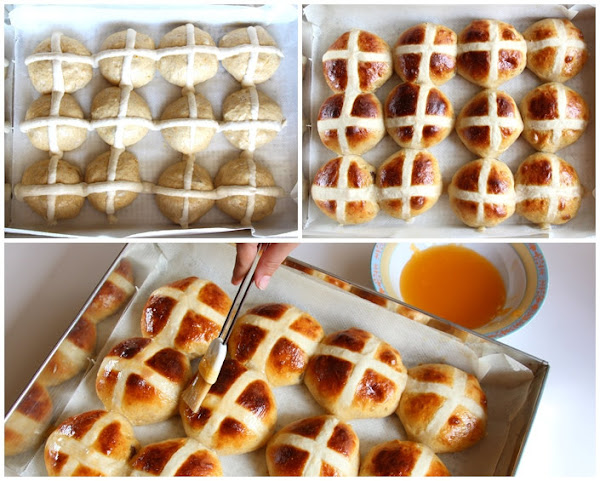 Quedé impresionada de como desaparece y aparece la cruz al hornearlos, ir mirando el horno y sabréis de lo que hablo, hay un momento que la cruz se funde con el resto del bollo, pero después se doran los laterales y queda la cruz totalmente marcada en blanco. Es muy curioso.