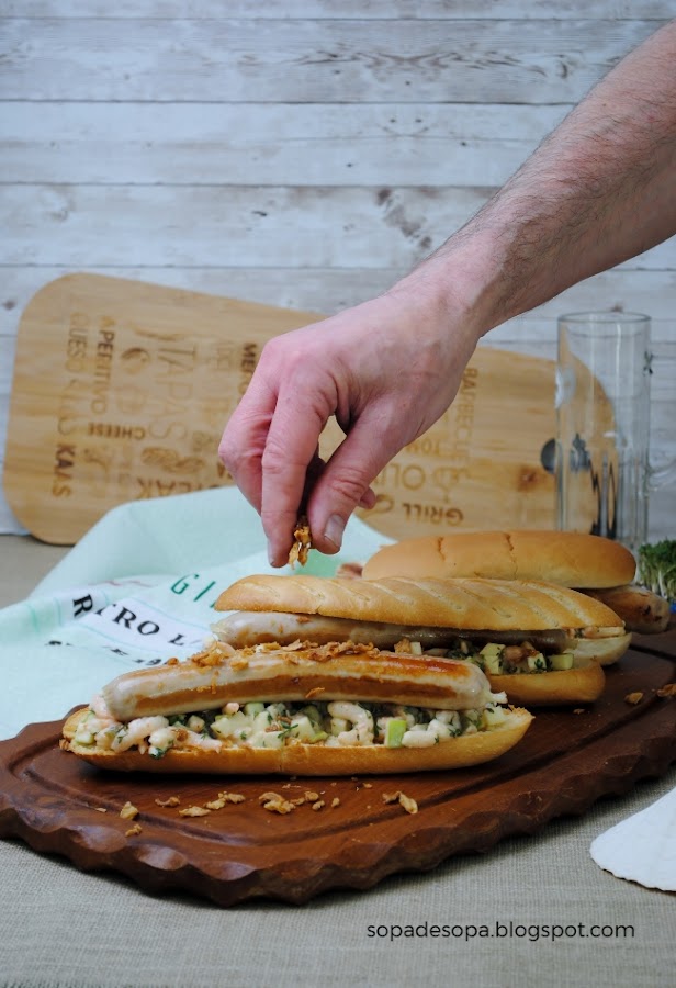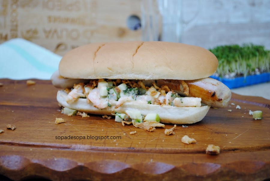 Combinar las gambitas con las salchichas no se me hubiera ocurrido nunca. Pero oye, queda muy rico, además da frescor la mezcla de manzana ácida con la mayonesa. Como que se hace menos pesado.