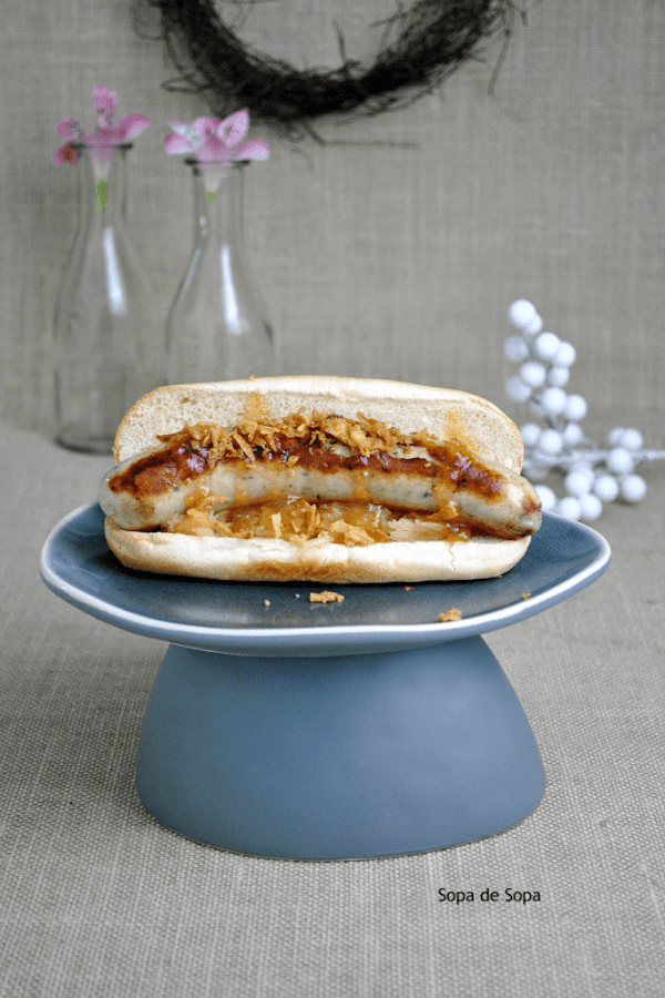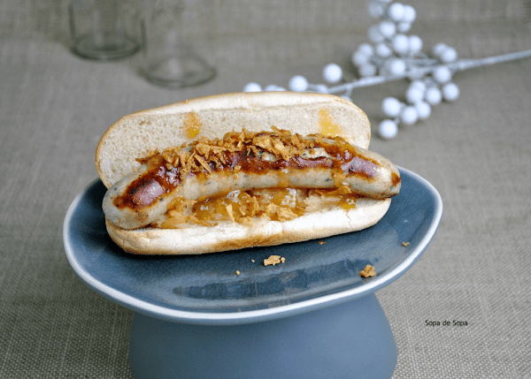 Rellenarlos con el chucrut escurrido, colocar una salchicha por pan, poner un poco de chutney de mango extendido por encima y espolvorear con la cebolla frita.