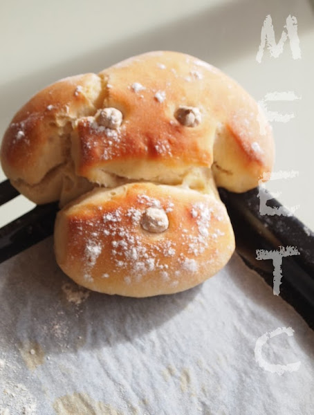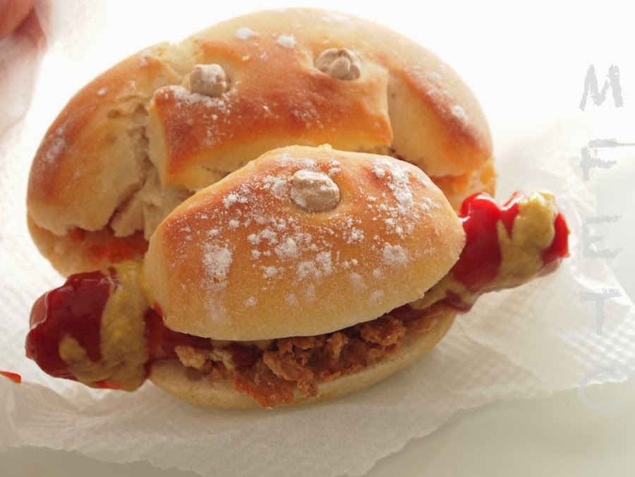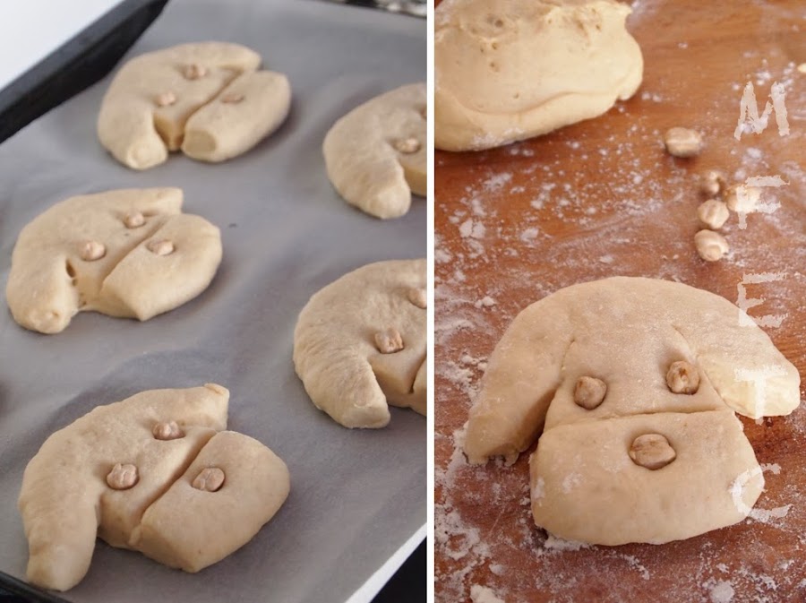 5. Bolear cada pieza espolvoreada de harina individualmente y darle forma al panecillo. Bien le puedes dar la típica forma de bollo alargado típica del Hot Dog o bien la forma de perrito como ves en la fotografía (para más detalles pregúntame).