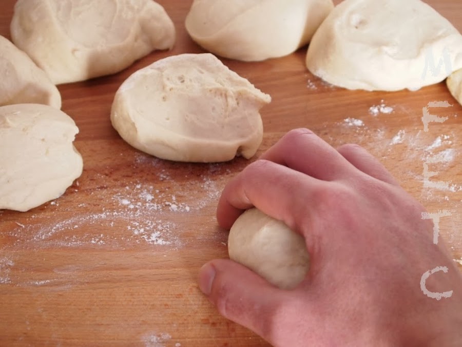 4. Pasado ese tiempo y cuando se supone que la masa habrá duplicado su volumen, sacarla del bol, y desgasificarla hincándole los dedos con un ligero amasado. Dividirla en piezas de 100 gr.