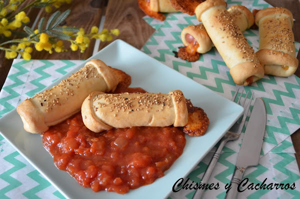 Colocar el queso y encima la salchicha, cerrar la masa(cerrar bien los extremos para que no se salga el queso) y colocar sobre la bandeja del horno con papel de hornear. Yo les puse una semillas de sésamo que tenía en casa pero es opcional.