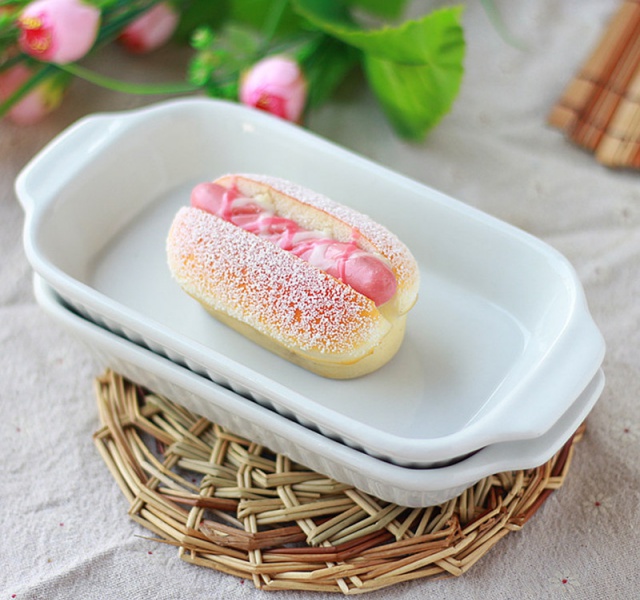 Para la decoración: Barniza la superficie del hot dog con la mantequilla fundida y enseguida esparce el azúcar granulada. Abre y coloca la salchicha dulce.