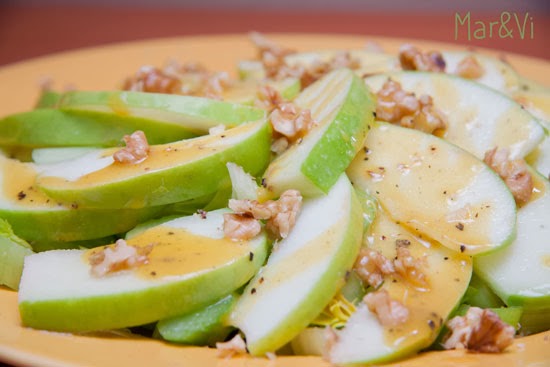 Por último montaremos la ensalada. En un plato grande, colocaremos primero el apio, encima las manzanas y las nueces, y verteremos por encima el aderezo.