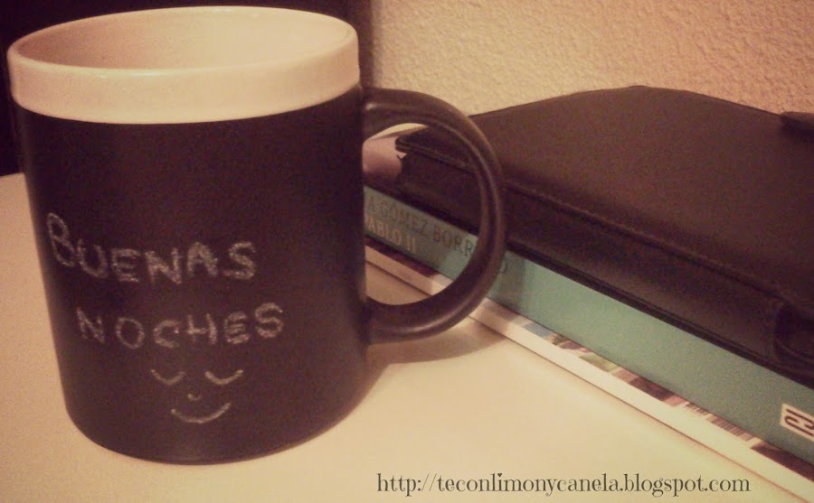 No puede faltar una infusión de roiboos (en la taza con pintura de pizarra que me regaló Rafa), y algo de lectura, en libro electrónico, en papel o una revista, pero tengo que leer un poco antes de cerrar los ojos...