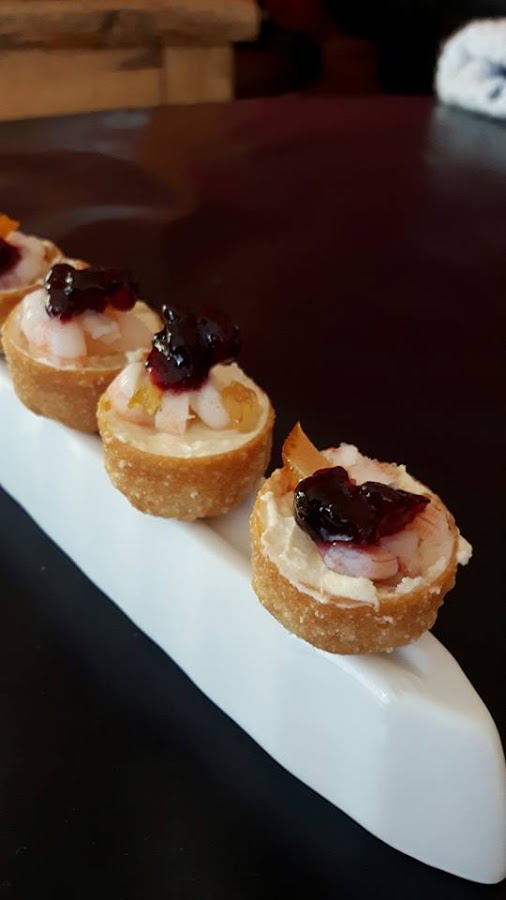 CUCHARITAS DE QUESO CREMA; LANGOSTINO COCIDO; PIEL DE NARANJA Y MERMELADA DE FRUTOS ROJOS del Blog ¡¡Oído Cocina!!