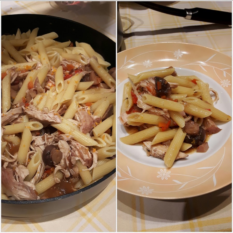Ragú de pollo y trompetas negras con penne rigati del Blog Chez Silvia