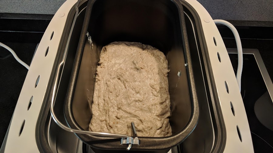 2. Echamos la mezcla en la cubeta de la panificadora y dejamos que repose un máximo de 1 hora (autólisis)