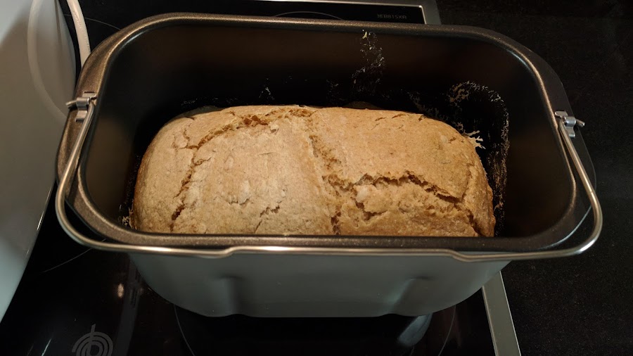 3. Pasado el tiempo agregamos la sal y la levadura y programamos pan normal (programa 1 en panificadora de lidl), peso 1 kilo y tostado fuerte