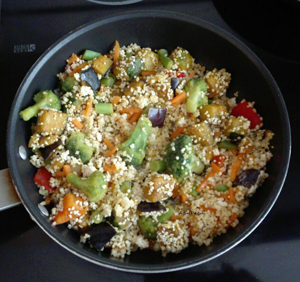 Pasados 3 minutos añadí menos de medio vaso de agua y lo salteé 3 minutos mas. Listo para comer.