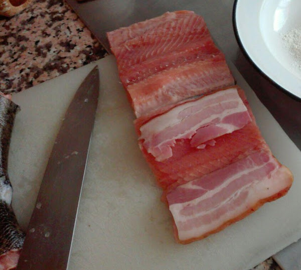 Para completar el plato lomo de trucha a la plancha, con un trocín de bacon y comida preparada.