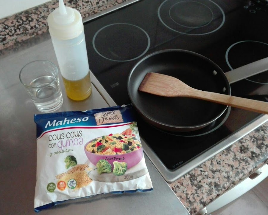 La semana pasada encontré un producto de Maheso "Cous cous con quinoa y verduras" que no había probado y que no se parecía a ninguno de los que conocía. Me pareció un producto interesante, contiene un 59% de verdura (judía verde, brócoli, zanahoria, cebolla, calabacín, berenjena y pimiento), 31% de cuscús y un 9% de quinoa. Me llamó la atención y estaba deseando probarlo.