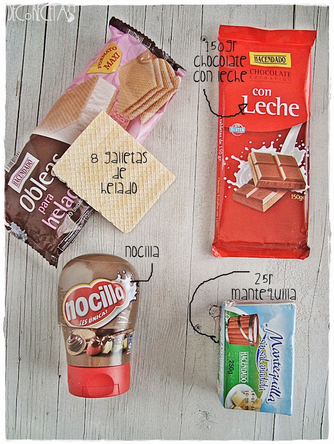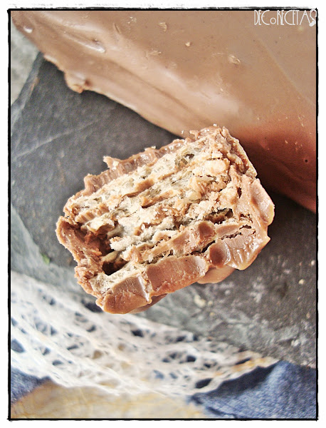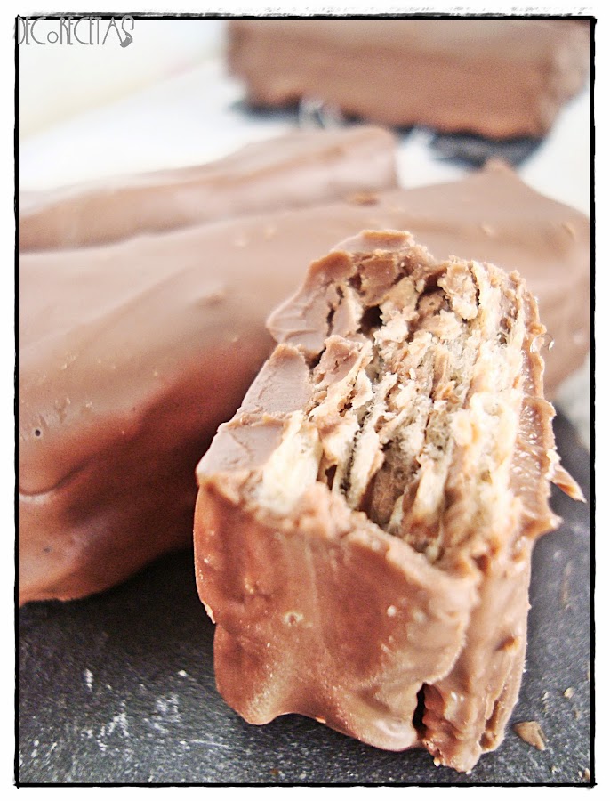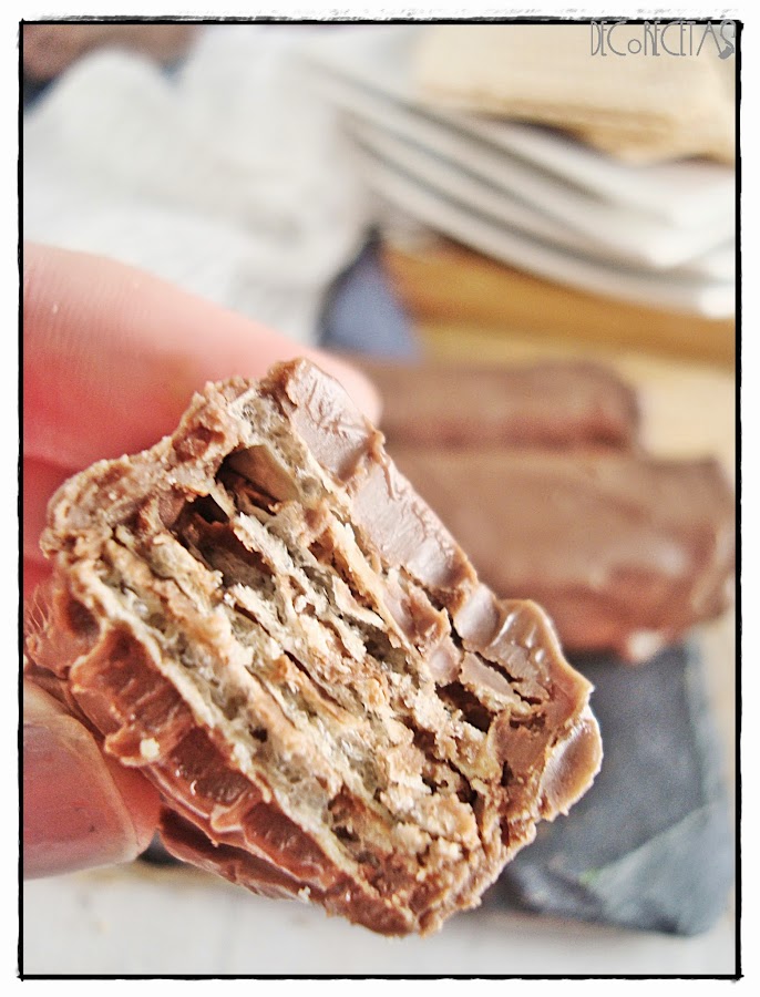 Las metemos en el congelador durante unos minutos para que la nocilla endurezca y una vez listas cortaremos cada rectángulo de oblea en tres partes iguales. Dichas partes las cubriremos con chocolate con leche y aceite mezclado y las pondremos encima de una rejilla para qué al verter el chocolate por encima, caiga el sobrante en un plato del que luego lo reutilizaremos