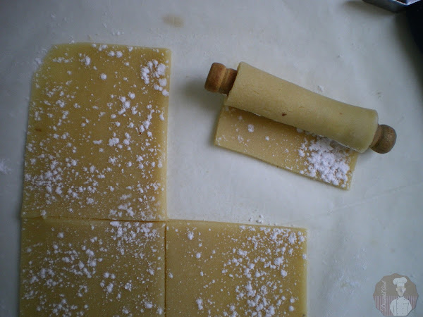 Con un palo (puede servir el del portarollos de papel de cocina), enrollar cada pequeño rectángulo sobre el palo espolvoreado con azúcar glas y cerrarlo sobre sí mismo humedeciendo los bordes para que pegue mejor. Hacer a cada tubo los típicos cortes transversales marcando suavemente con el mismo cortapastas.