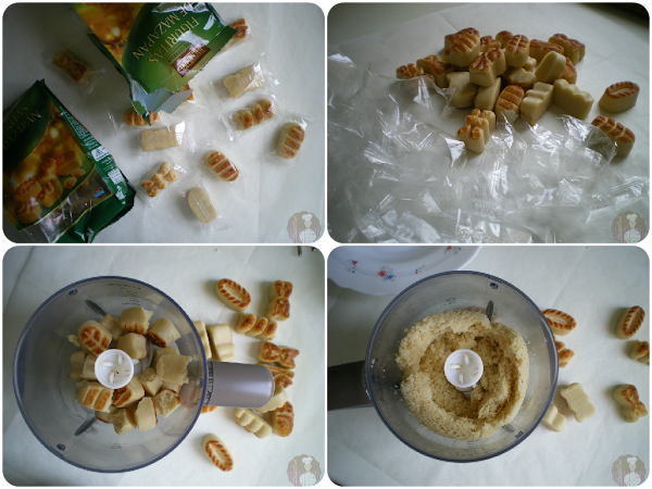 En mi estreno con estos manjares quise coger un atajo saltándome la elaboración del mazapán. Compré 2 bolsas de figuritas de mazapán ya elaborado aprovechando que los productos navideños están ya a la venta con la antelación cada vez más temprana que caracteriza a las grandes superficies. Mi idea era que triturándolo al máximo quedaría con una textura moldeable que me permitiría confeccionar los "canutos" de mazapán. ¡Fracaso absoluto! Traté de enmendarlo con un almíbar, pero ni por esas; así que ha quedado para otra futura receta.