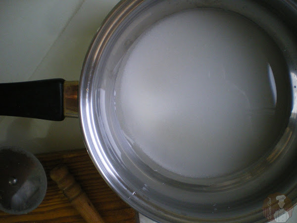 En un cazo mediano, verter el agua junto al azúcar. Encender el fuego y comenzar a remover hasta disolver completamente el azúcar. Una vez hierva, mantener unos 5 segundos y apartar del fuego.