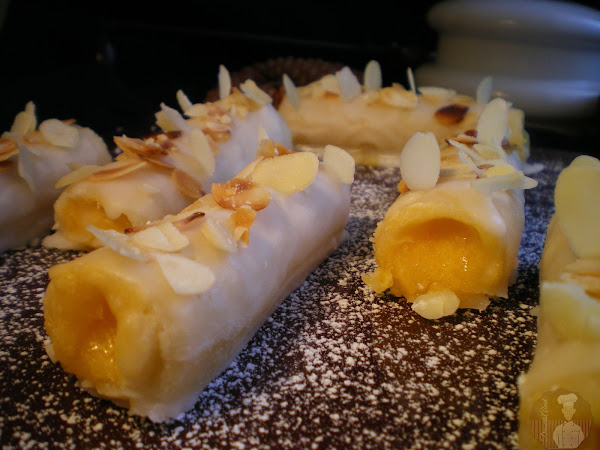 Rellenar con el dulce de yema los tubos de mazapán por ambos lados.Glaseado final