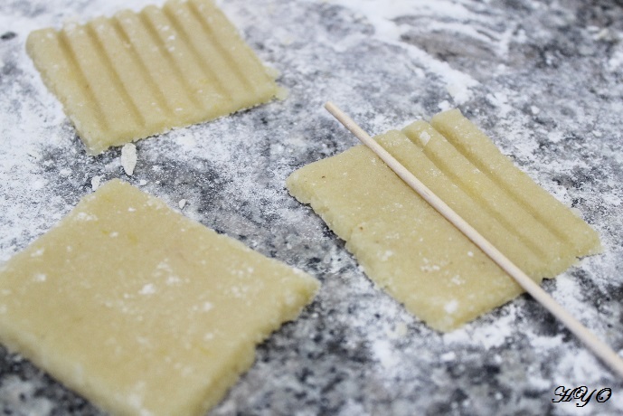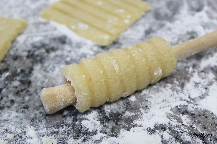 3. Una vez hechos todos los rectángulos, los enroscaremos formando cilindros con ayuda de un palito (un lápiz, un palillo chino, el mango de algún accesorio de cocina...). Este es un paso delicado, debemos ser cuidadosos a la hora de manipular la masa para que no se rompa. Para que la unión quede bien sellada podemos mojarla con un poco de agua.