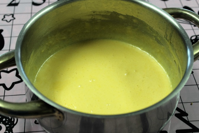5. Mientras tanto, vamos a preparar la crema de yema. De nuevo tendremos que hacer un almíbar con el agua y el azúcar, lo mezclamos bien y hervimos durante cinco minutos. A continuación, vertemos el almíbar en un recipiente apto para "baño de maría", dejamos que se atempere y añadimos las yemas removiendo constantemente para que no se nos cuajen. Llevamos la mezcla al fuego, a baño de maría, sin parar de remover hasta que se espese (20 -30 minutos).Tened en cuenta que debe quedar una crema firme para que no se salga de los cilindros de mazapán.