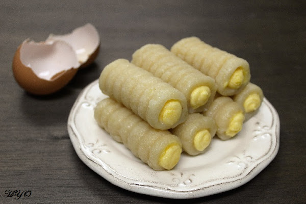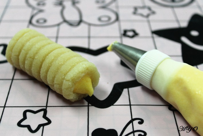 6. Continuamos rellenando los huesos con la crema de yema ya fría y el mazapán seco. Introducimos la crema en una manga pastelera de boquilla redonda y pequeña, y con cuidado, rellenamos cada uno de los cilindros.