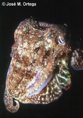 Vuelvo despacio, las anémonas con su vaivén parecen que me saludan al pasar, los negros erizos me avisan que no les toque y las marrones algas se mecen junto a una gran roca………¡¡ espera, Toñi, no sigas…!! Es una jibia mimetizada entre las algas.