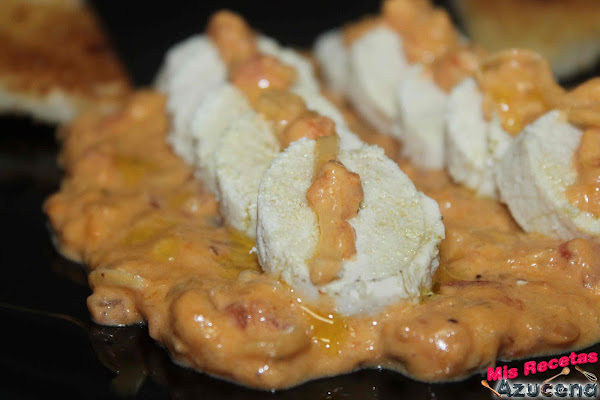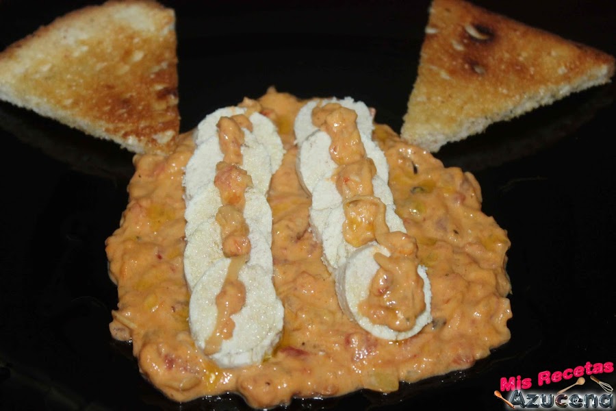 Para presentar este plato pondremos una cama de la salsa que acabamos de preparar, encima pondremos unas rodajas de hueva y un poco de salsa, para terminar le pondremos un poco de aceite de oliva a las huevas.