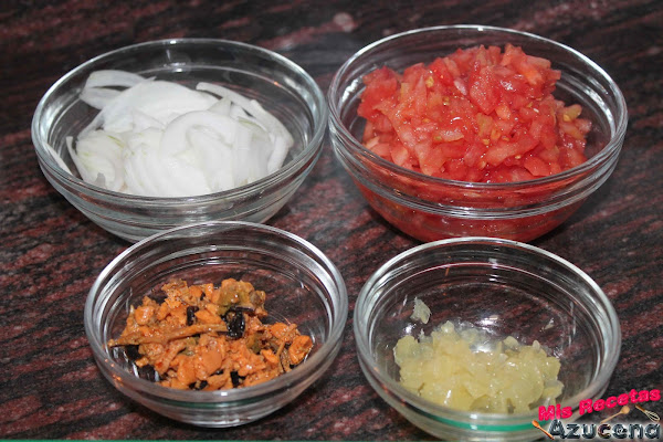 Los tomates los pelaremos y los picaremos en cuadraditos, los mejillones los picaremos menudos y el limón lo picaremos en trozos muy pequeños, reservamos todo por separado.