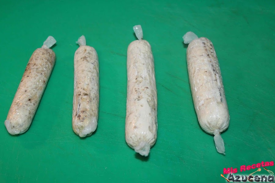 Una vez las tengamos cortadas cogemos un trozo de film transparenté, ponemos una hueva, salpimentamos y enrollaremos con el film, tienen que quedar como si fuese un caramelo y que nos quede bien apretada, una vez la tengamos bien enrollada cogeremos los extremos y les haremos un nudo para que no se abran.