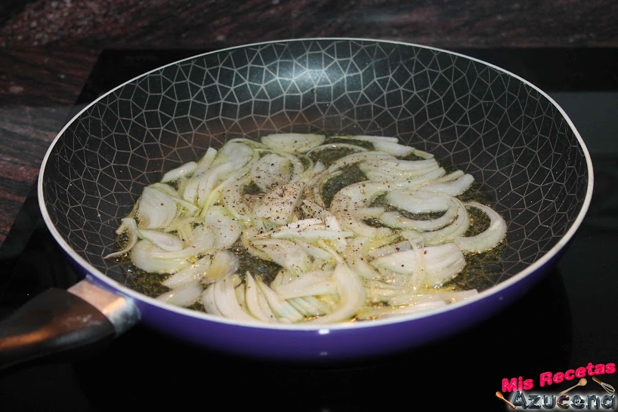Ponemos una sartén al fuego, a fuego medio cuando este calienta añadiremos un fondo de aceite y añadiremos la cebolleta picada, salpimentamos y dejamos sofreír durante 3 minutos.
