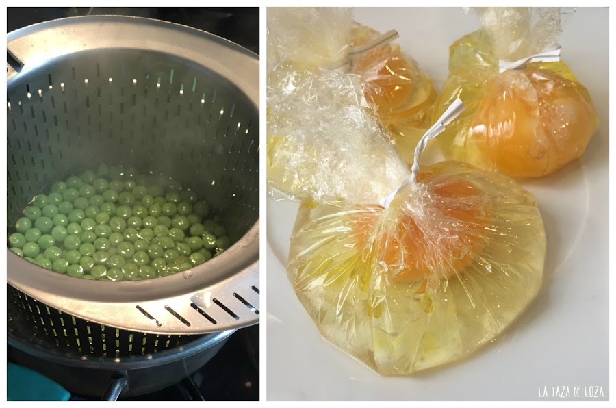 Pelar y sacar de las vainas los guisantes y cocerlos en agua caliente unos 4 minutos, no más pues quedarían muy blandos y una de las gracias que además tiene este plato es que los guisantes contrastan con el resto. Os he dejado la imagen para que veáis como los he cocido, sobre un colador, es más fácil. Se quita el agua y se reservan.