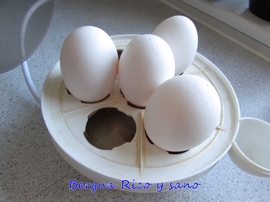 1. Hacemos un huevo pasado por agua. Para que la clara quede cuajada y la yema solo un poco, le daremos 4 minutos desde que el agua rompa a hervir. Mi abuela los hacía al baño maría y yo, si hago más de uno a la vez, tengo un aparatico para hervir huevos.