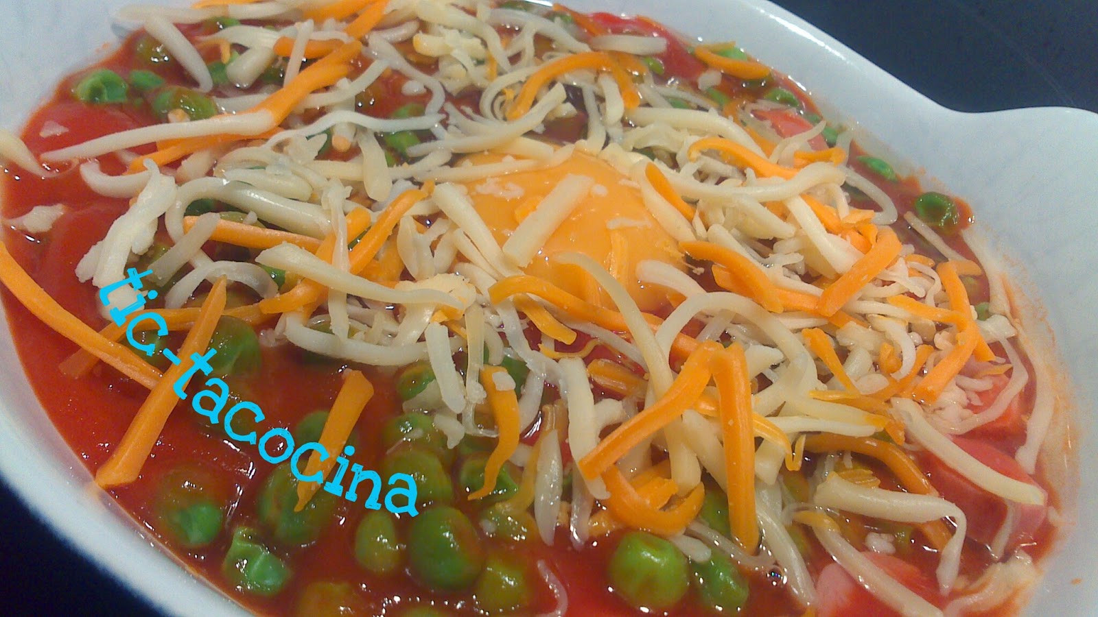 Cubrir con tomate, añadir las salchichas en rodajitas y mezclar todo. Cascar el huevo en un cuenco aparte para comprobar que esta bien y evitar que nos pueda caer cascara en la preparación, y poner uno en cada cuenco.