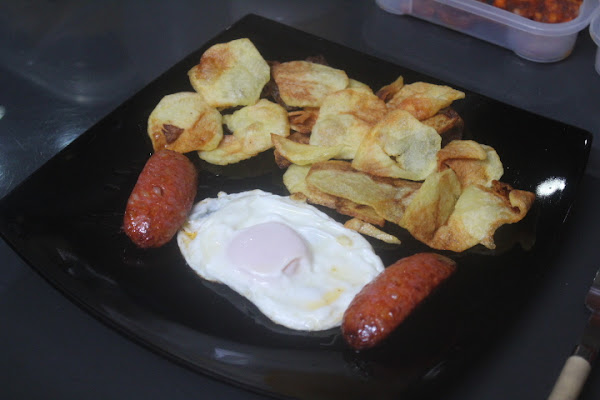 Aunque unos huevos fritos con chorizo y patatas fritas está muy visto, lo habitual es acompañar el huevo de patatas cortadas a lo largo, en esta ocasión he optado por hacer unas patatas de bolsa caseras (patatas chips).