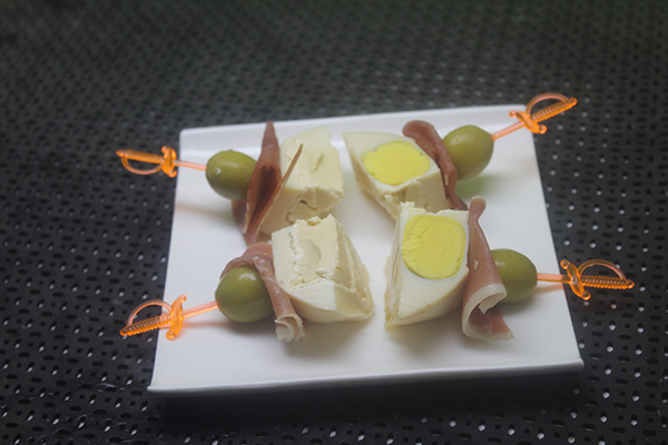 Insertamos las aceitunas en cuatro palillos, añadimos a cada palillo un trocito de jamón dobladito y unimos a cada cuadradito de huevo.
