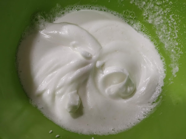 a continuación cogeremos las claras y echamos una pizca de azúcar y procederemos a montar a punto de nieve, lo podemos hacer con unas varillas manuales o eléctricas lo que tengáis, hasta que queden a punto de nieve,