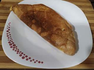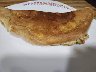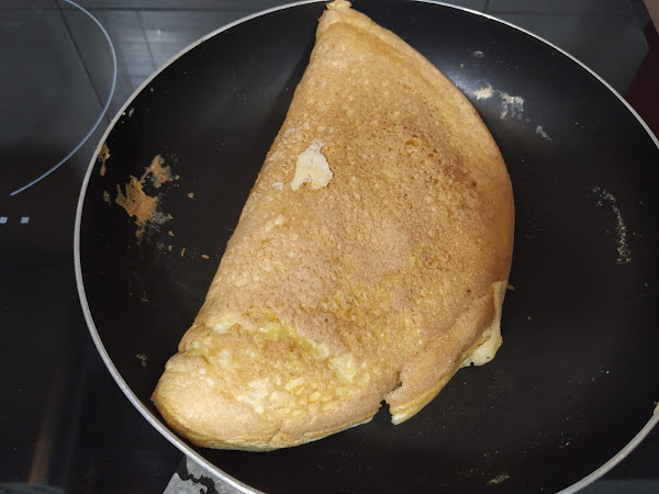 dejamos que se vaya haciendo a fuego bajo durante aproximadamente 5 minutos más o menos, ahora con la ayuda de una cuchara de madera procedemos a doblar nuestra tortilla por la mitad (es decir hacemos una doblez con forma de media luna)