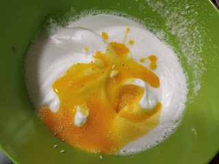 ahora cogeremos las yemas que teníamos reservadas y las echamos junto con las claras montadas