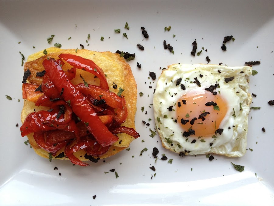 Una mezcla de sabores , texturas, aromas, el lujo de la trufa , el sabor intenso del pimiento y la tersura del huevo frito , hace de cada bocado una delicia ...