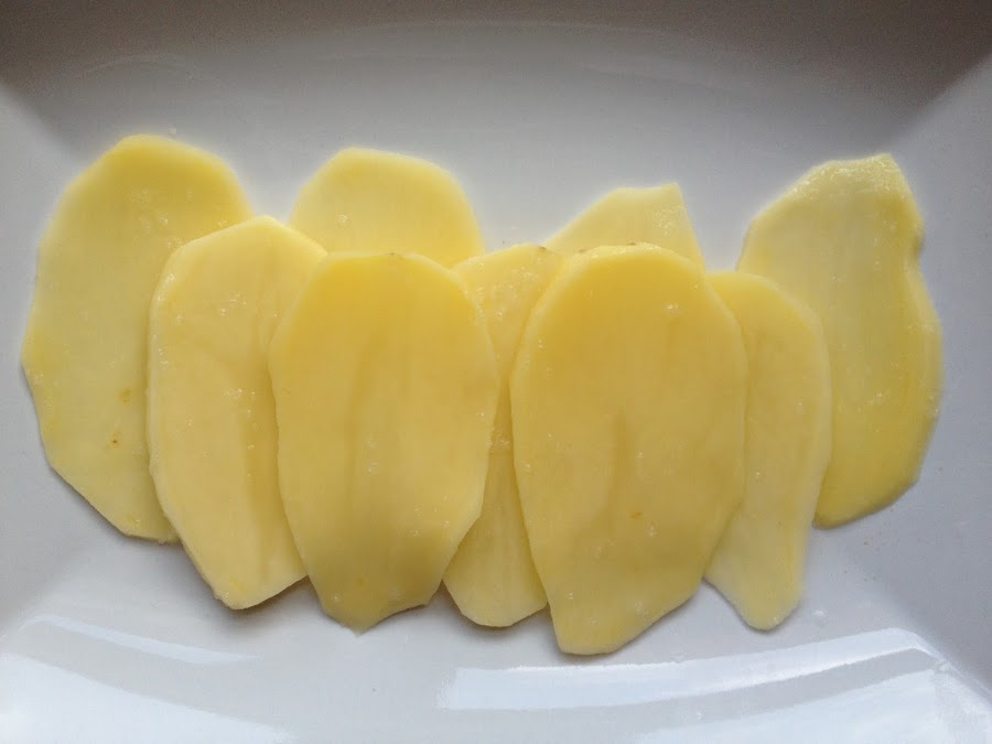 1 Tras pelar las patatas las cortamos con una mandolina , y las salamos.