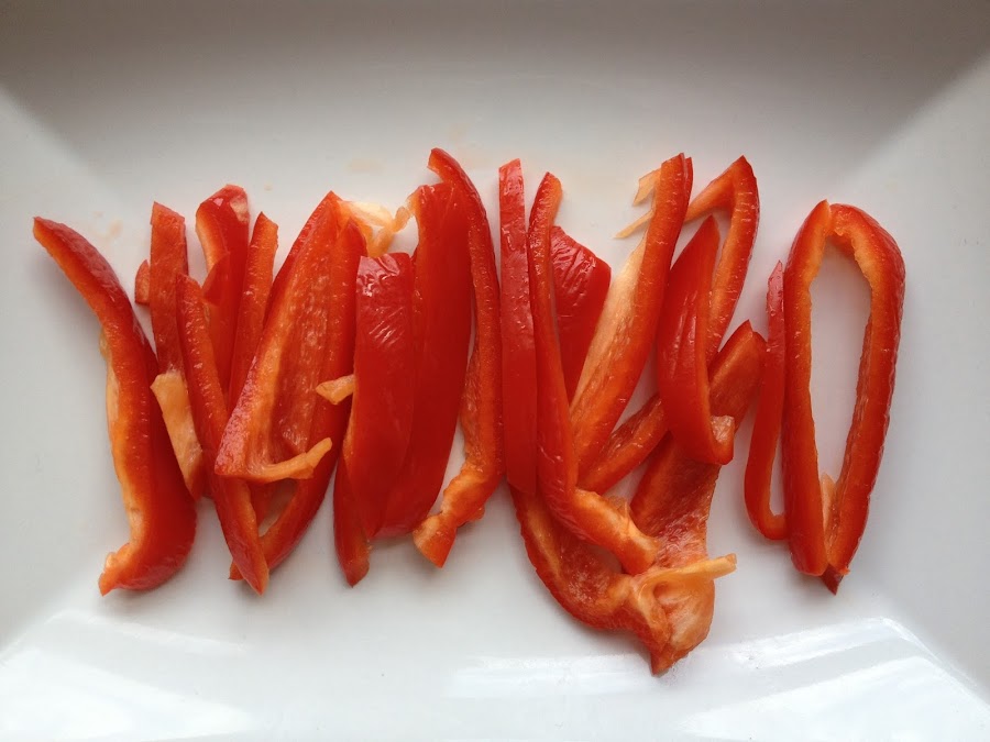 3 Mientras que se van friendo las patatas , cortamos el pimiento en juliana o tiras .