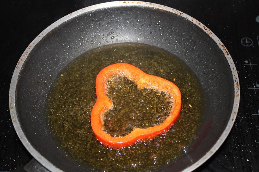 Cortamos el pimiento en aros de 1cm. de ancho y lo ponemos a freír, le damos la vuelta y le echamos el huevo dentro